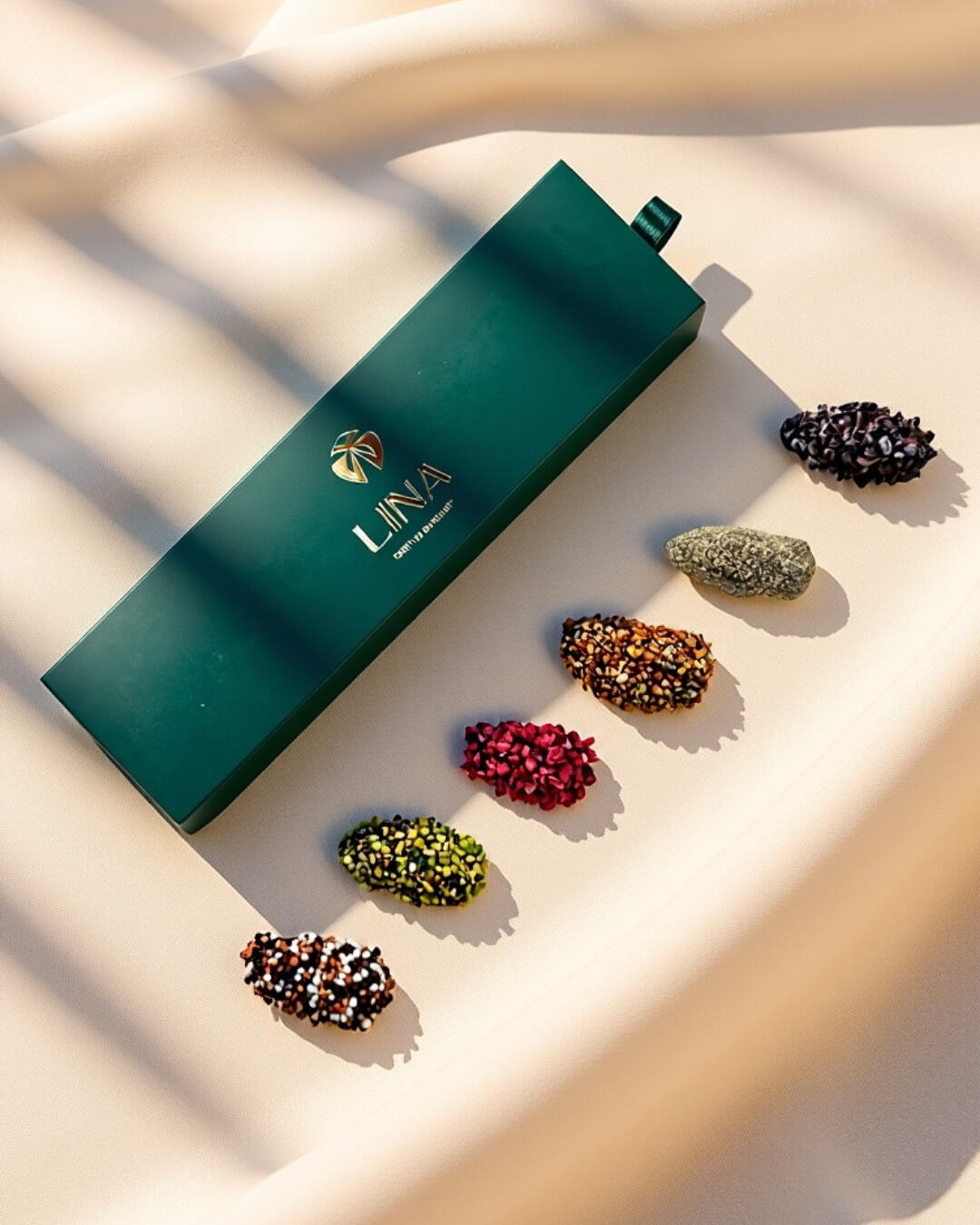 Chez LINA Dates & Delights, nous sublimons la reine des dattes, la Deglet El Nour, en créations d’exception.